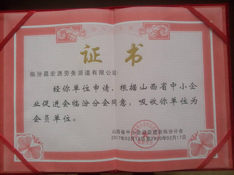 熱烈祝賀!臨汾昌宏源勞務派遣有限公司獲得山西省中小型企業(yè)促進會臨汾分會授予的會員單位的稱號